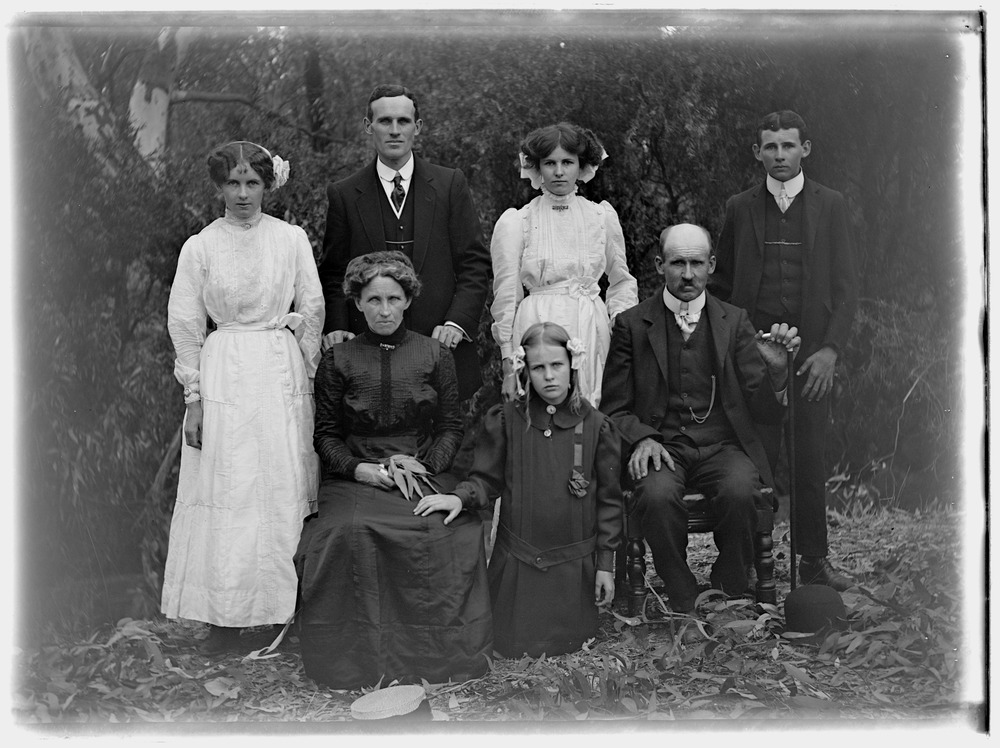 Charles with wife Annie Lubina Ewart with sons Walter Arthur Ewart, Service no 438, and Alfred Stanley Ewart 2626 KIA Pozieres France. c 1905 Daughters possibly Elsie, Olive and Myrtle at their farm at Tamleugh