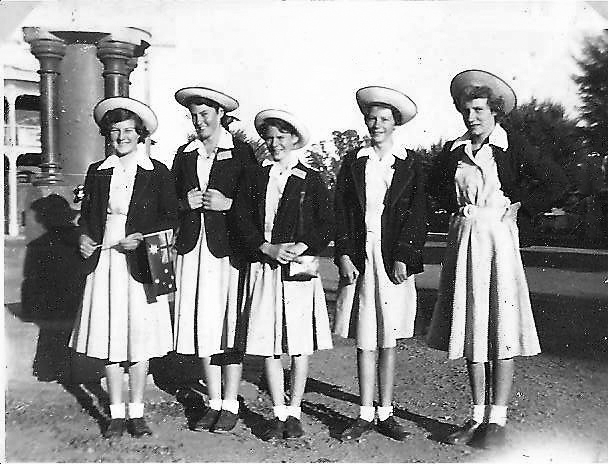 - Morning of the Queen's visit 1954. Waiting for the school bus. Lorraine Brown, Kath Hayes, Dawn Humphries, Mavis Gibbs, Judy Blake..jpg