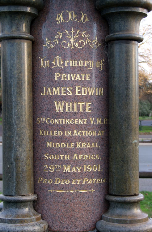 The drinking fountain was originally erected to commemorate Privates Charles Edwin Williams, and James Edwin White, who were killed in the South African (Boer) War.